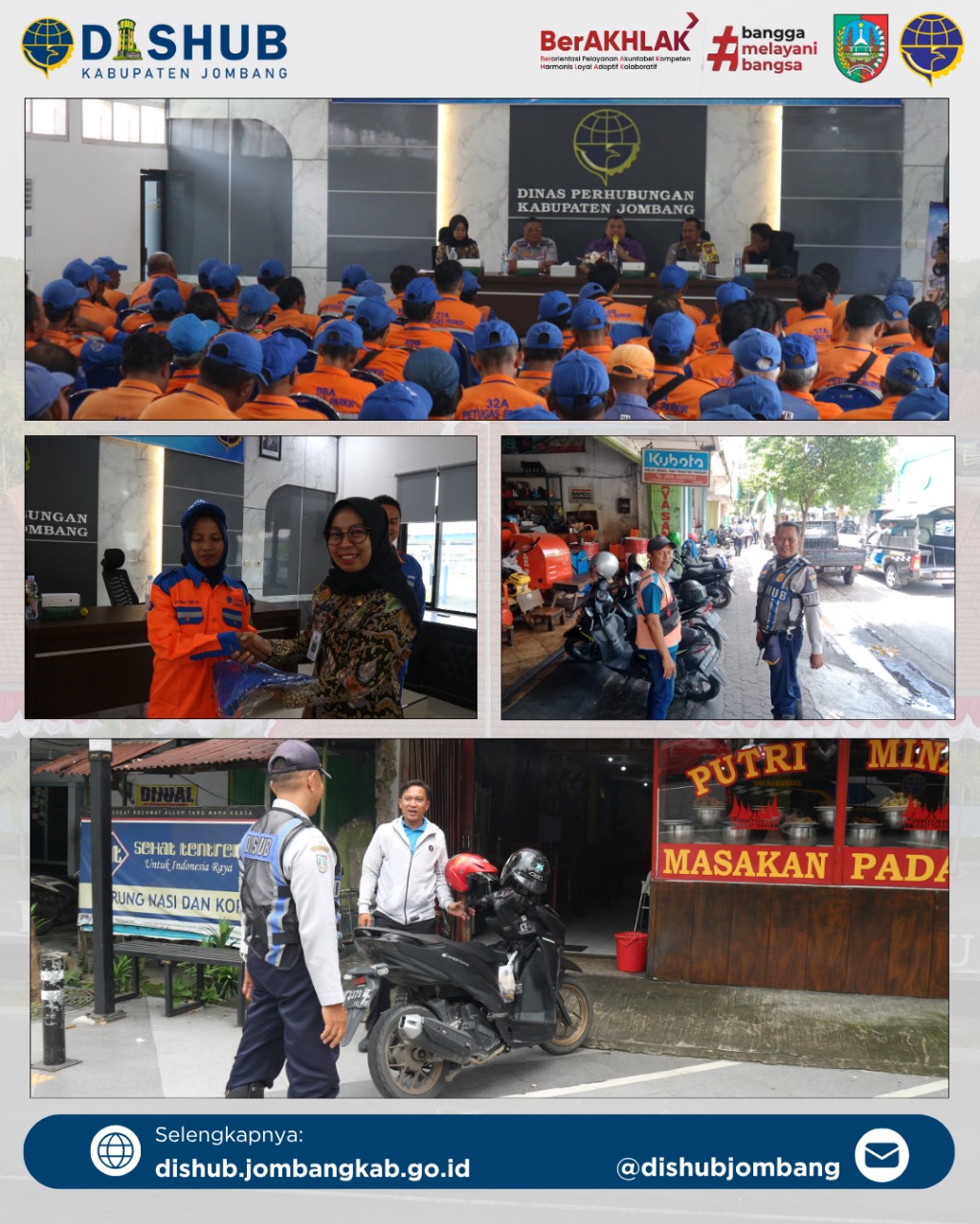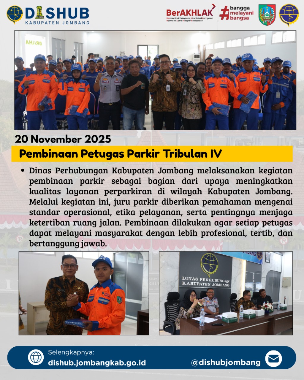 JOMBANG — DISHUBJBG_ 20 November 2025 — Dinas Perhubungan Kabupaten Jombang kembali menggelar kegiatan pembinaan bagi petugas parkir sebagai bagian dari upaya menjaga ketertiban, kelancaran, dan kenyamanan di ruang jalan. Kegiatan ini dilaksanakan dengan tujuan meningkatkan pemahaman serta kompetensi para petugas parkir yang berperan langsung dalam pelayanan kepada masyarakat.