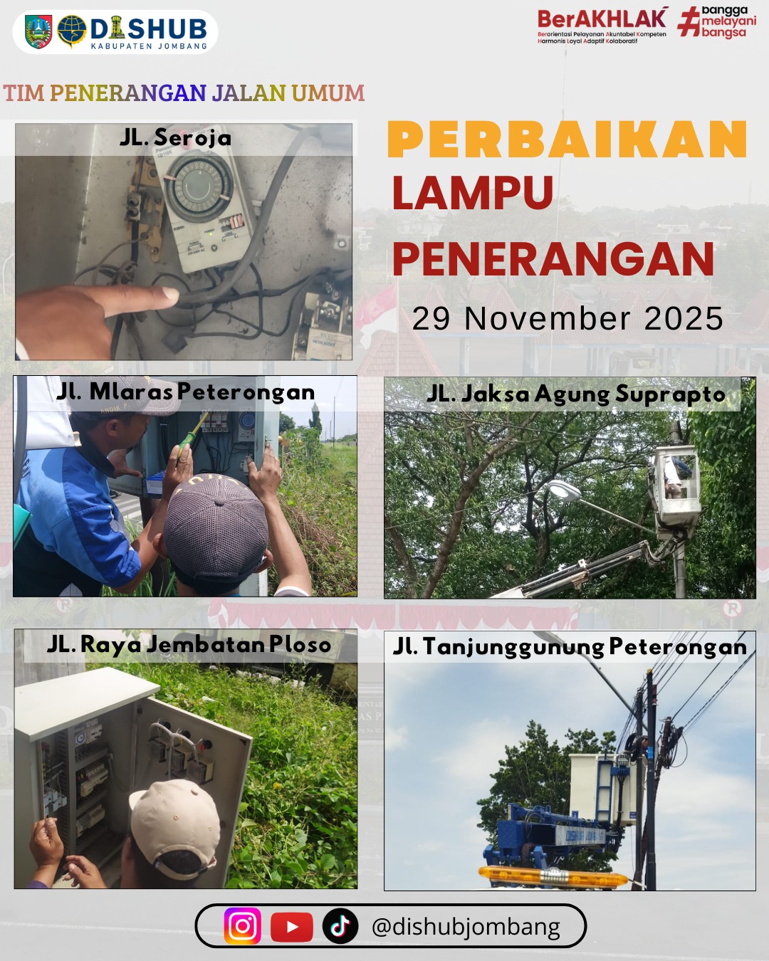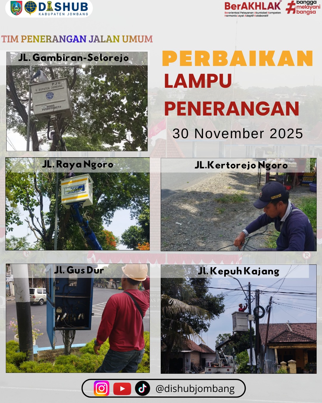 Petugas teknis Dishub Jombang melakukan pemeriksaan menyeluruh, perbaikan gangguan, hingga penggantian lampu yang mengalami kerusakan. Adapun lokasi yang menjadi sasaran pemeliharaan meliputi: