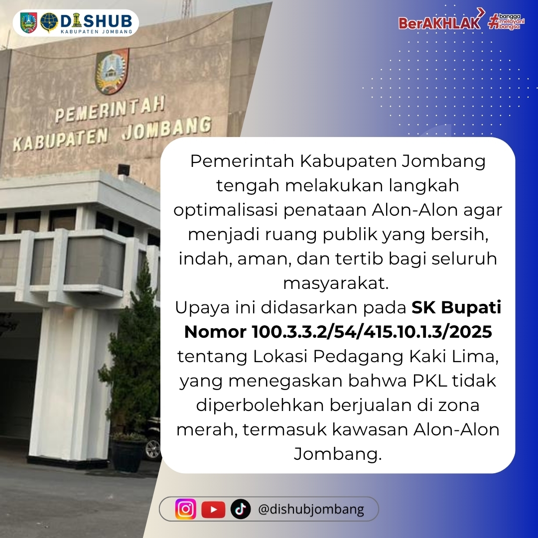 Jombang — DISHUBJBG_ Pemerintah Kabupaten Jombang menyatakan komitmennya untuk menata kembali kawasan Alon-Alon agar kembali berfungsi sebagai ruang publik yang bersih, indah, aman, dan tertib. Penataan ini didasarkan pada Surat Keputusan Bupati Jombang Nomor 100.3.3.2/54/415.10.1.3/2025, yang menetapkan Alon-Alon sebagai Zona Merah yang wajib bebas dari seluruh aktivitas Pedagang Kaki Lima (PKL).