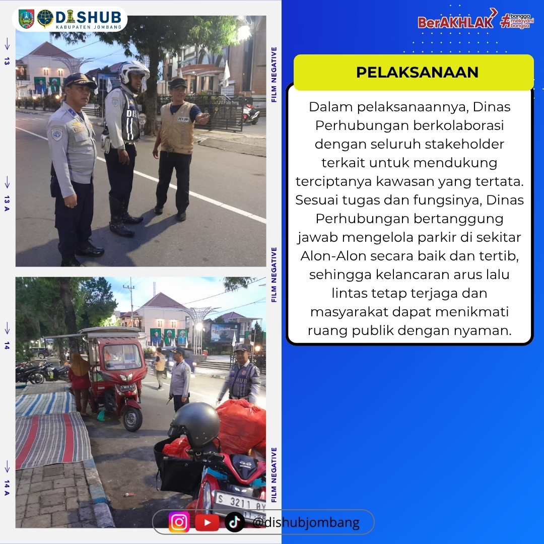 Dalam proses penataan tersebut, Dinas Perhubungan Kabupaten Jombang memegang peran strategis, khususnya dalam memastikan pengaturan lalu lintas dan penataan parkir di kawasan Alon-Alon berjalan dengan optimal. Dishub melakukan pengawasan terhadap lokasi parkir resmi, mengatur keluar-masuk kendaraan, serta melakukan penertiban pada parkir liar yang berpotensi mengganggu kelancaran arus lalu lintas.