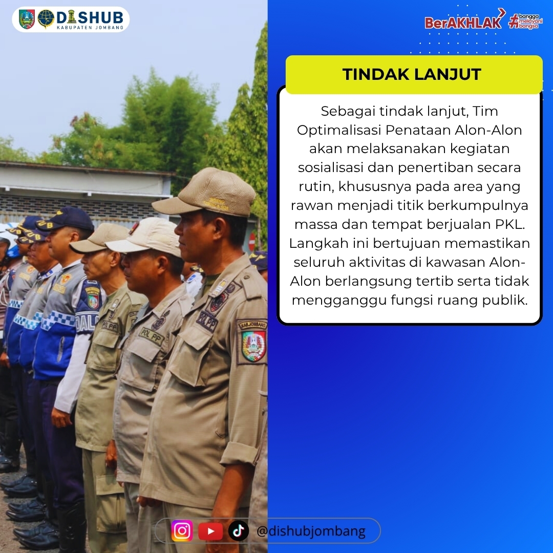 Sebagai tindak lanjut dari ketetapan tersebut, Pemerintah Kabupaten Jombang membentuk Tim Optimalisasi Penataan Alon-Alon yang bertugas melaksanakan sosialisasi, pengawasan, dan penertiban secara berkala. Sasaran utama kegiatan ini meliputi titik-titik yang selama ini menjadi lokasi kerumunan dan aktivitas perdagangan yang tidak sesuai dengan peruntukan ruang publik.
