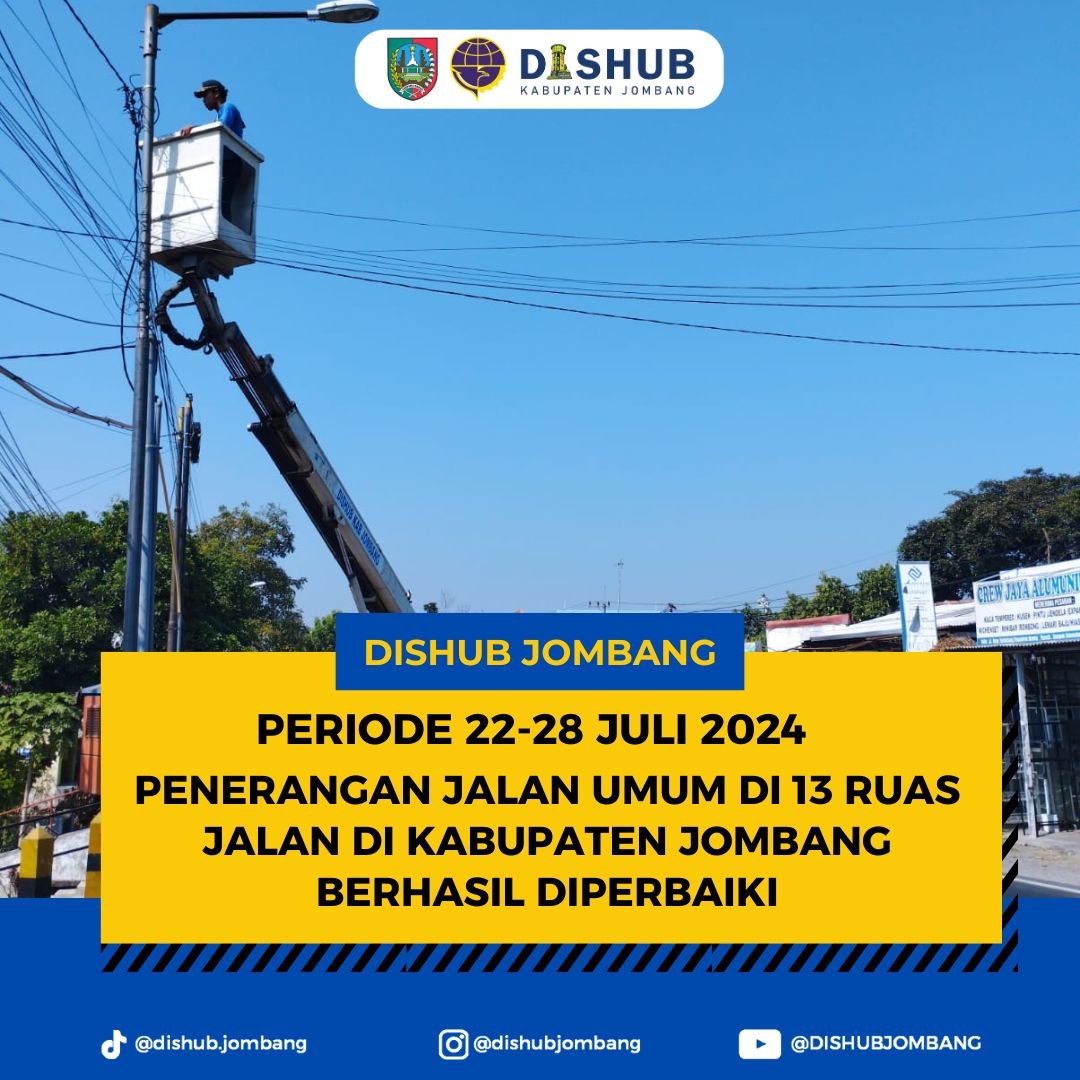 DISHUBJBG – Dalam Rangka menciptakan kenyamanan dan keselamatan lalu lintas di Kabupaten Jombang, Seksi Perlengkapan jalan Bidang Lalu Lintas Dinas Perhubungan Kabupaten Jombang melaksanakan pemeliharaan penerangan jalan umum yang tidak berfungsi dengan baik dibeberapa Lokasi di Kabupaten Jombang
