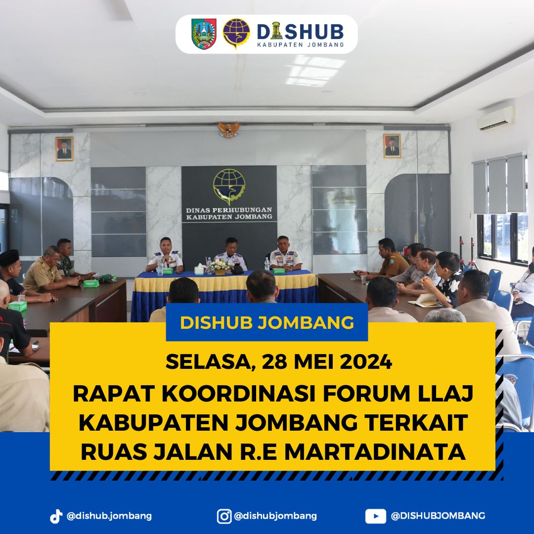 DISHUBJBG – Dalam rangka menciptakan keselamatan dan kelancaran lalu lintas di kabupaten jombang serta sebagai tindak lanjut keluhan masyarakat terkait kemacetan di ruas Jalan R.E martadinata, pada tanggal 28 Mei 2024 Dinas Perhubungan Kabupaten Jombang melaksanakan rapat forum LLAJ yang dihadiri oleh Kaur min Ops Polres Jombang, Kanit Turjawali Satlantas polres jombang, polsek Kota Jombang, Koramil Jombang, Camat Jombang, Bappeda Kab. Jombang, Satpol PP Kab. Jombang, Dinas PUPR Kab. Jombang, DPMPTSP Kab. Jombang, Kepala Desa Kepatihan, Serta perwakilan pelaku usaha yang mana di hadiri Toko Sumber Alam, Toko Rejeki, Toko Lina, Toko Perkasa, dan Bakso Mama.