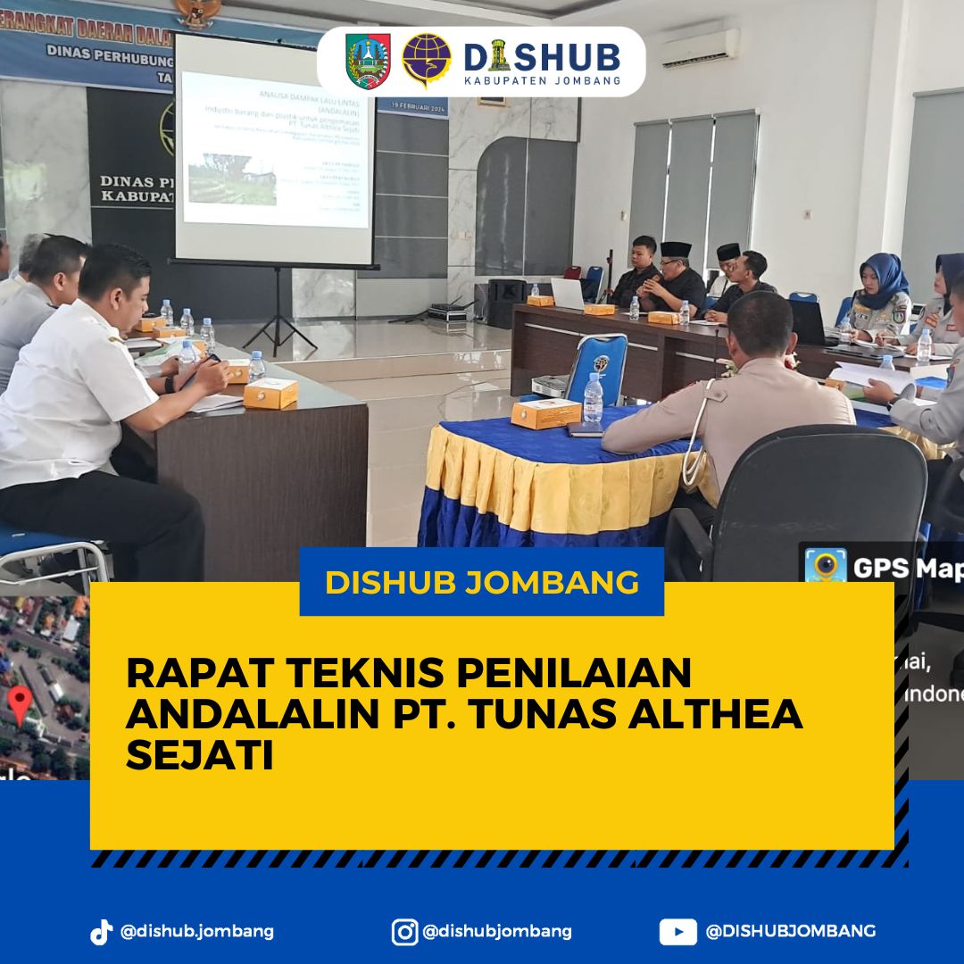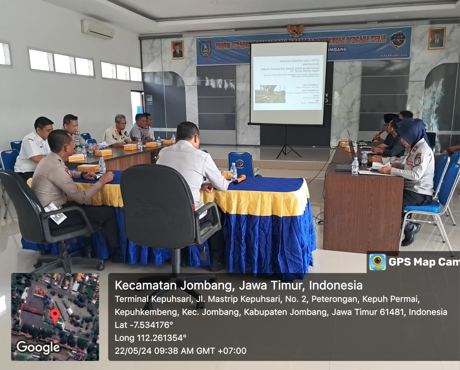 DISHUBJBG – Rapat teknis penilaian Andalalin PT. Tunas Althea Sejati pembangunan industri barang dari plastik untuk pengemasan di jalan Raya Gambiran - Selorejo, Desa Catakgayam, Kecamatan Mojowarno, Kabuapten jombang yang dihadiri oleh kepala Dinas Perhubungan, Kabid Lalu Lintas, Kabid Dalops dan perparkiran, Kasi Manrek, Kasi Dalops, Satlantas Polres Jombang, Dinas penanaman modal dan PTSP, Dinas PUPR, Satpol PP, Dinas lingkungan hidup, pemilik perusahaan dan konsultan andalalin.