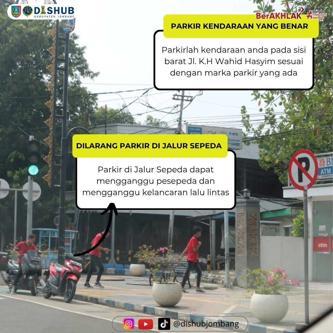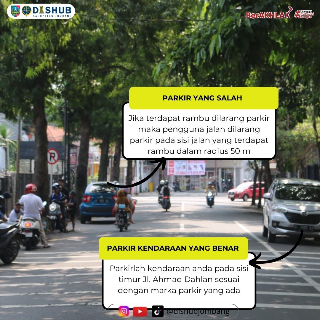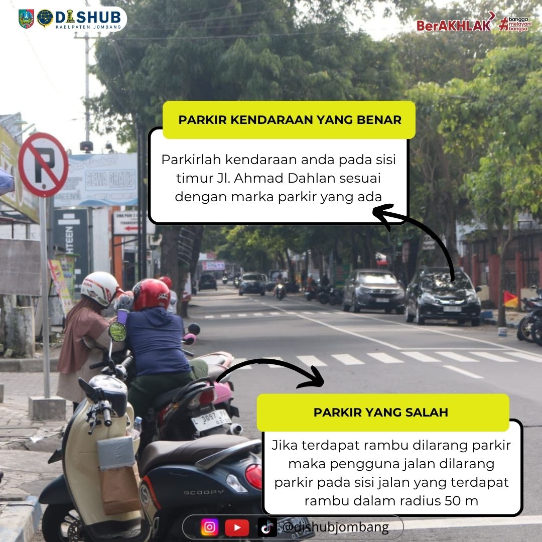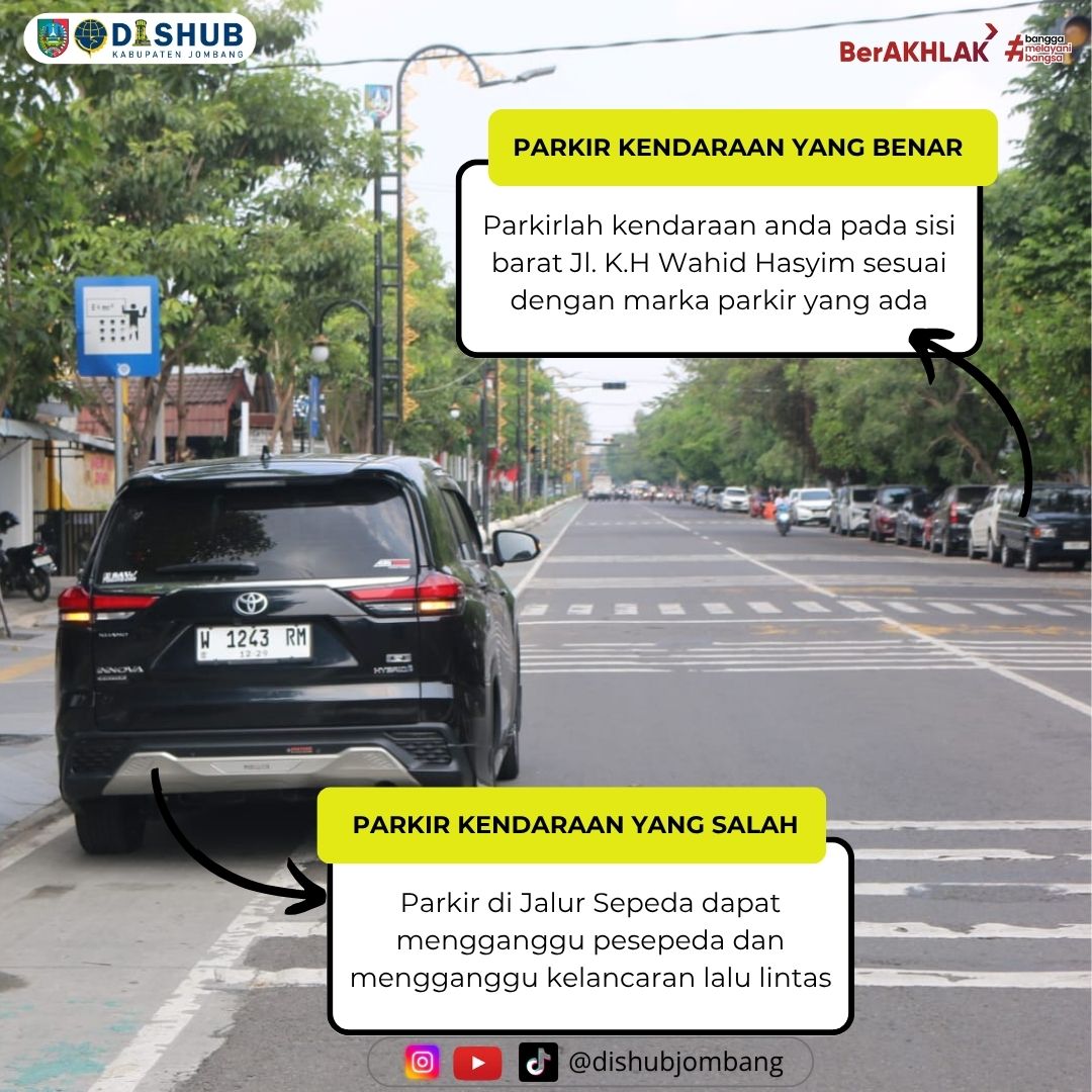 DISHUB.JBG, Dinas Perhubungan Kabupaten Jombang mengimbau kepada seluruh masyarakat untuk selalu memarkirkan kendaraan di lokasi yang telah disediakan, tidak di trotoar, bahu jalan, jalur sepeda, atau area dilarang lainnya.
